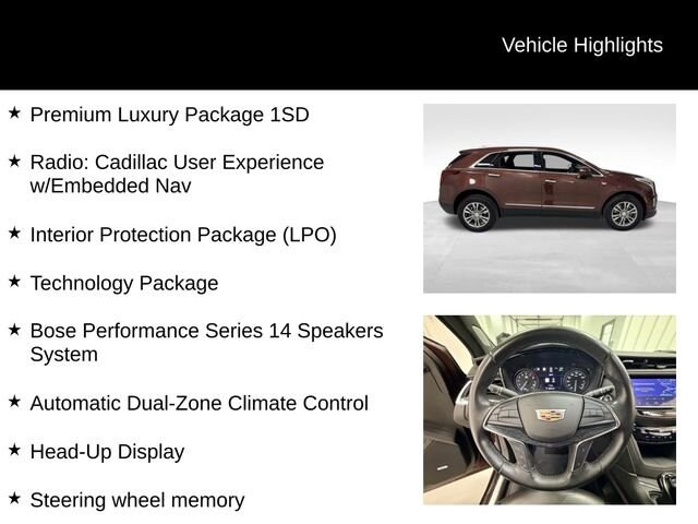 Certification Program Details: Karl Chevrolet of Ankeny, The Nation's #1 CarBravo Certified Dealer! Every CarBravo Certified vehicle includes: Comprehensive 126-Point Inspection Professionally inspected by factory-trained technicians to meet strict mechanical, safety, and cosmetic standards. 12-Month / 12,000-Mile Bumper-to-Bumper Limited Warranty Enjoy added peace of mind with extensive coverage from the day you drive off the lot. 24/7 Roadside Assistance & Courtesy Transportation Flat tire? Dead battery? Need a tow? You're covered anywhere, anytime throughout the warranty period. Vehicle History & Title Guarantee Clean title, completed safety recalls, and a full CARFAX® or AutoCheck® report provided for complete transparency. 10-Day / 500-Mile Exchange Promise If you don't absolutely love it, bring it back and exchange it no hassle, no stress. Experience peace of mind and premium protection exclusively from Karl Chevrolet of Ankeny, the Nation's #1 CarBravo Dealer! TECHNOLOGY PACKAGE Cadillac User Experience with Embedded Navigation 3.6L V6 Engine Rosewood Metallic Exterior Interior Protection Package (LPO) Puddle Lamps with Cadillac Crest (LPO)This stunning 2022 Cadillac XT5 Premium Luxury AWD is a true testament to Cadillac's commitment to craftsmanship and innovation. Boasting a powerful 3.6L V6 engine and an advanced all-wheel-drive system, this vehicle delivers an exhilarating driving experience while providing the utmost in comfort and convenience.The XT5's premium features, including the Cadillac User Experience with Embedded Navigation, Bose Premium Audio System, and Head-Up Display, elevate the driving experience to new heights. The spacious and well-appointed interior, with its luxurious leather seating and premium materials, creates an environment that is both sophisticated and inviting.Certified by Karl Chevrolet's rigorous inspection process, this XT5 has undergone a comprehensive 126-point evaluation to ensure it meets the highest standards of quality and safety. With a 12-month/12,000-mile bumper-to-bumper warranty and 24/7 roadside assistance, you can drive with confidence, knowing that your investment is protected.Whether you're seeking a versatile family hauler or a sophisticated luxury crossover, the 2022 Cadillac XT5 Premium Luxury AWD is a standout choice. Experience the perfect blend of power, technology, and refinement that this exceptional vehicle has to offer.At Karl Chevrolet we want to help you find the best new or used car in Ankeny that suits your needs. When you buy a new car at Karl Chevrolet you know you're finding a vehicle you can rely on. We have a great selection of Platinum Quality Pre-Owned Vehicles. We also pride ourselves in creating a friendly atmosphere and a reliable Dealership that you can trust. Call us and our experts will be glad to help you! (515) 299-4300. *Equipment and options are generated by a 3rd party vendor, exact vehicle options may vary. Please see a salesperson for complete details and vehicle information.