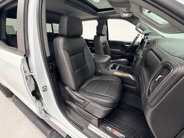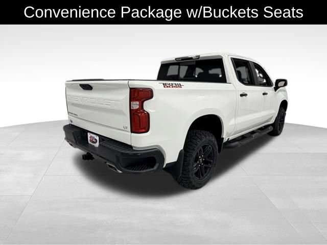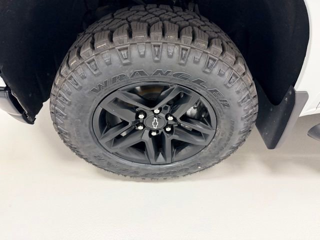 The exterior features a striking white paint job, complemented by the bold, blacked-out Trail Boss styling cues. LED headlights and fog lamps provide excellent visibility, while the power-sliding rear window and power sunroof add to the truck's versatility and premium feel.