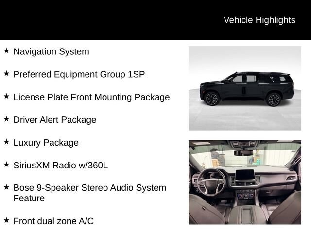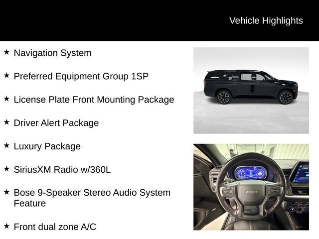 Inside, the Suburban's cabin is spacious and well-appointed, with luxurious touches like a power panoramic sunroof, heated steering wheel, and premium Bose audio system. The Luxury Package adds even more premium features, including memory settings, a hands-free power liftgate, and advanced driver assistance technologies like Rear Pedestrian Alert and HD Surround Vision.