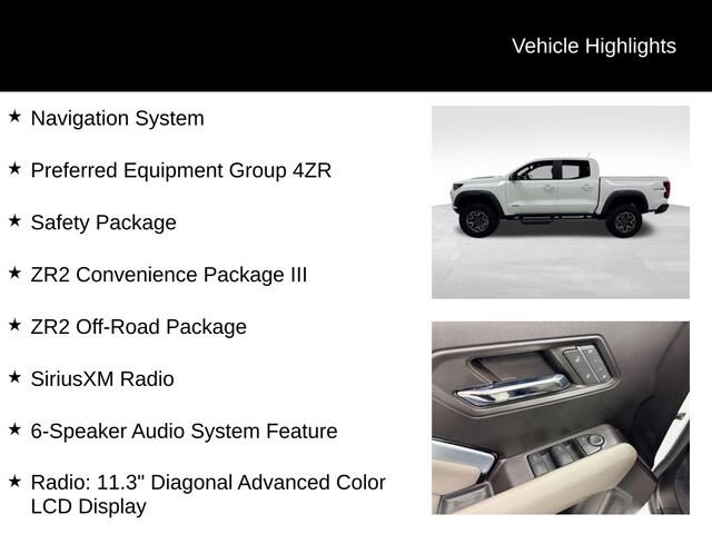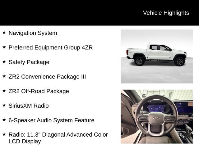 Certification Program Details: Karl Chevrolet of Ankeny, The Nation's #1 CarBravo Certified Dealer! Every CarBravo Certified vehicle includes: Comprehensive 126-Point Inspection Professionally inspected by factory-trained technicians to meet strict mechanical, safety, and cosmetic standards. 12-Month / 12,000-Mile Bumper-to-Bumper Limited Warranty Enjoy added peace of mind with extensive coverage from the day you drive off the lot. 24/7 Roadside Assistance & Courtesy Transportation Flat tire? Dead battery? Need a tow? You're covered anywhere, anytime throughout the warranty period. Vehicle History & Title Guarantee Clean title, completed safety recalls, and a full CARFAX® or AutoCheck® report provided for complete transparency. 10-Day / 500-Mile Exchange Promise If you don't absolutely love it, bring it back and exchange it no hassle, no stress. Experience peace of mind and premium protection exclusively from Karl Chevrolet of Ankeny, the Nation's #1 CarBravo Dealer!- ZR2 CONVENIENCE PACKAGE III- LICENSE PLATE KIT, FRONT- Preferred Equipment Group 4ZR- Safety Package- ZR2 Off-Road Package- Navigation System- 6-Speaker Audio System Feature- Radio: 11.3 Diagonal Advanced Color LCD Display- SiriusXM Radio- Front dual zone A/C- Rear-Window Electric Defogger- Power driver seat- Automatic Emergency Braking- Front Pedestrian & Bicyclist Braking- Rear Park AssistThis 2024 Chevrolet Colorado ZR2 4WD CREW ZR2 is a rugged and capable off-road beast, packed with premium features that elevate your driving experience. Powered by a potent 2.7L I4 Turbocharged engine, this Colorado ZR2 delivers an impressive 310 horsepower and 17 MPG in the city and on the highway. The 8-speed automatic transmission and 4WD system ensure smooth and confident handling, whether you're navigating the urban jungle or tackling the great outdoors.Exterior-wise, the Colorado ZR2 stands out with its bold, white finish and a host of off-road-ready enhancements. The 17-inch graphite and oxide gold aluminum wheels, front fog lights, and rear step bumper add both style and functionality. Inside, the cabin is outfitted with premium features that elevate your driving experience, including a 11.3-inch advanced color LCD display, wireless charging, and a heated steering wheel.Safety is also a top priority, with advanced driver-assistance technologies like Automatic Emergency Braking, Front Pedestrian & Bicyclist Braking, and Rear Park Assist keeping you and your passengers secure. The Colorado ZR2 also boasts Chevy Safety Assist, which includes features like Forward Collision Alert, Lane Keep Assist with Lane Departure Warning, and Blind Zone Steering Assist with Trailering.This Colorado ZR2 is a true off-road champion, ready to take you on your next adventure. Experience the perfect blend of capability, technology, and comfort in this exceptional vehicle. Visit Karl Chevrolet of Ankeny today to take this impressive Colorado ZR2 for a test drive and discover how it can enhance your driving experience.At Karl Chevrolet we want to help you find the best new or used car in Ankeny that suits your needs. When you buy a new car at Karl Chevrolet you know you're finding a vehicle you can rely on. We have a great selection of Platinum Quality Pre-Owned Vehicles. We also pride ourselves in creating a friendly atmosphere and a reliable Dealership that you can trust. Call us and our experts will be glad to help you! (515) 299-4300. *Equipment and options are generated by a 3rd party vendor, exact vehicle options may vary. Please see a salesperson for complete details and vehicle information.