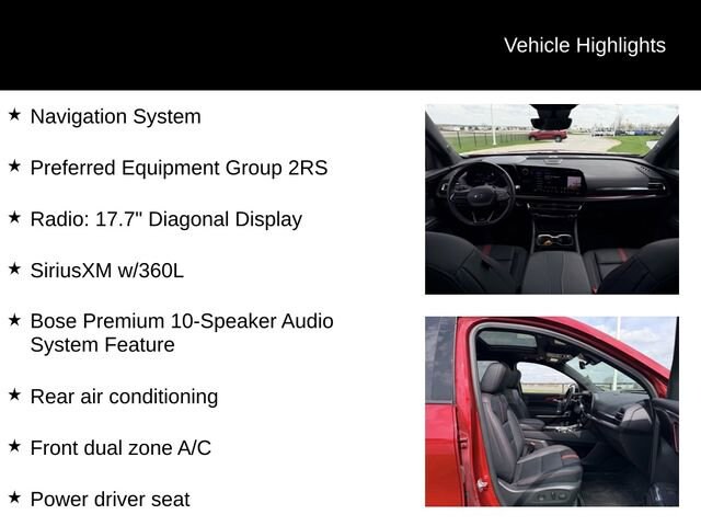 Inside, you'll find a wealth of advanced technology, including a large 17.7 diagonal display, SiriusXM with 360L, and Apple CarPlay/Android Auto integration. The Bose Premium 10-speaker audio system provides an immersive listening experience, while the heated steering wheel, heated and ventilated front seats, and heated rear seats ensure maximum comfort no matter the weather.