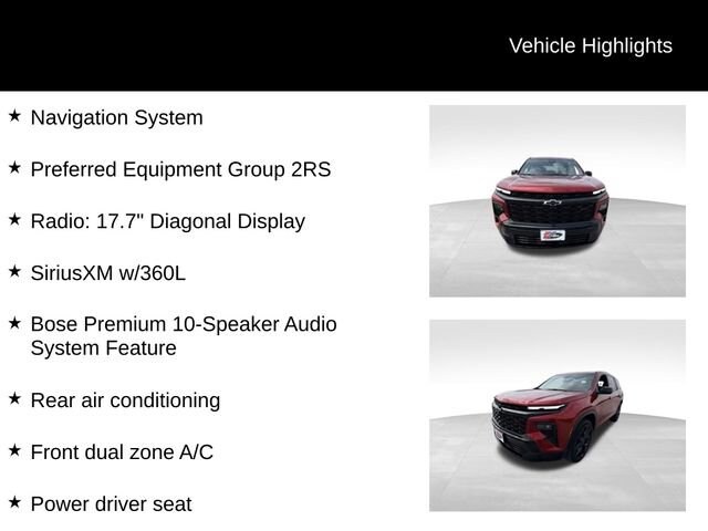 This 2024 Chevrolet Traverse RS is the perfect combination of style, comfort, and capability. With its bold Radiant Red Tintcoat exterior and premium interior features, this vehicle is sure to turn heads wherever you go. The Traverse RS boasts an impressive 2.5L DOHC engine, paired with an 8-speed automatic transmission and all-wheel drive, delivering a smooth and efficient driving experience.