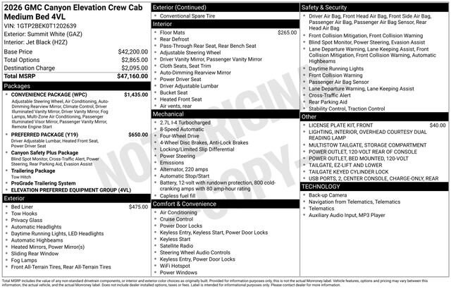 Summit White 2026 GMC 4D Crew Cab Canyon Elevation 2.7L I4 Turbocharged DOHC 16V LEV3-SULEV30 310hp 17/22 City/Highway MPG 8-Speed Automatic 4WD