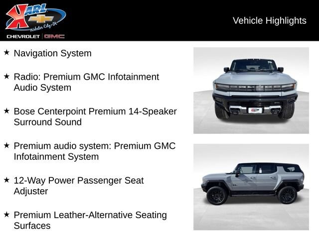 12-Way Power Passenger Seat Adjuster, Bose Centerpoint Premium 14-Speaker Surround Sound, Front Bucket Seats, Front Center Armrest, Heated front seats, Heated rear seats, Navigation System, Power passenger seat, Premium audio system: Premium GMC Infotainment System, Premium Leather-Alternative Seating Surfaces, Radio: Premium GMC Infotainment Audio System, Split folding rear seat, Wheels: 22 x 9.5 Gloss Black Painted Aluminum. Meteorite 2026 GMC Hummer EV SUV 2X 4D Sport Utility Electric Drive Unit 59/48 City/Highway MPG 1-Speed Automatic AWD