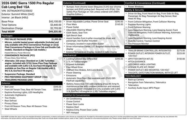 Whether you're tackling tough jobs or embarking on thrilling adventures, the 2026 GMC Sierra 1500 Pro is the perfect companion. With its impressive capabilities, advanced technology, and exceptional comfort, this truck is ready to elevate your driving experience. Visit our showroom today to take the Sierra 1500 Pro for a test drive and discover the power of this remarkable vehicle. Price includes: $1750 - Buick & GMC Consumer Cash Program. Exp. 04/30/2026 $1750 - Buick GMC Bonus Cash. Exp. 04/30/2026