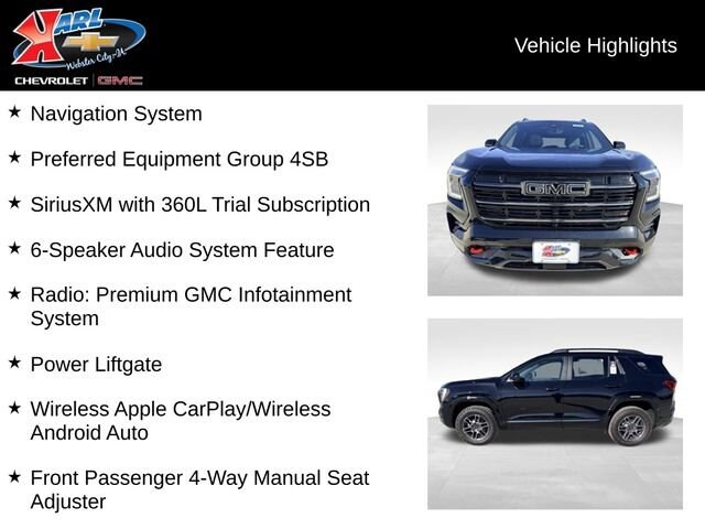 AWD, 2-Way Power Driver Lumbar Seat Adjuster, 6-Speaker Audio System Feature, Cloth/Core Tec Seat Trim, Driver and Front Passenger Heated Seats, Front Bucket Seats, Front Center Armrest, Front Passenger 4-Way Manual Seat Adjuster, Heated front seats, Navigation System, Power Liftgate, Preferred Equipment Group 4SB, Radio: Premium GMC Infotainment System, SiriusXM with 360L Trial Subscription, Split folding rear seat, Wheels: 17 Dark Machined Aluminum, Wireless Apple CarPlay/Wireless Android Auto. Ebony Twilight Metallic 2026 GMC Terrain AT4 4D Sport Utility 1.5L DOHC 24/26 City/Highway MPG 8-Speed Automatic with Overdrive AWD
