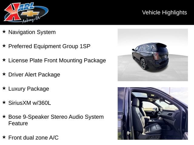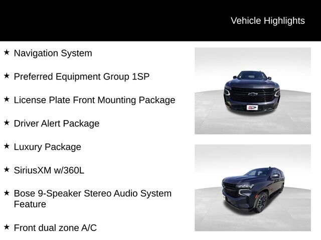 The Luxury Package elevates this Tahoe to new heights, adding a host of premium features like Adaptive Cruise Control, Enhanced Automatic Emergency Braking, and a stunning Dual-Pane Panoramic Sunroof that floods the cabin with natural light. Heated and ventilated front seats, a heated steering wheel, and heated second-row outboard seats ensure everyone rides in comfort. The advanced Bose audio system and integrated navigation provide exceptional entertainment and connectivity.