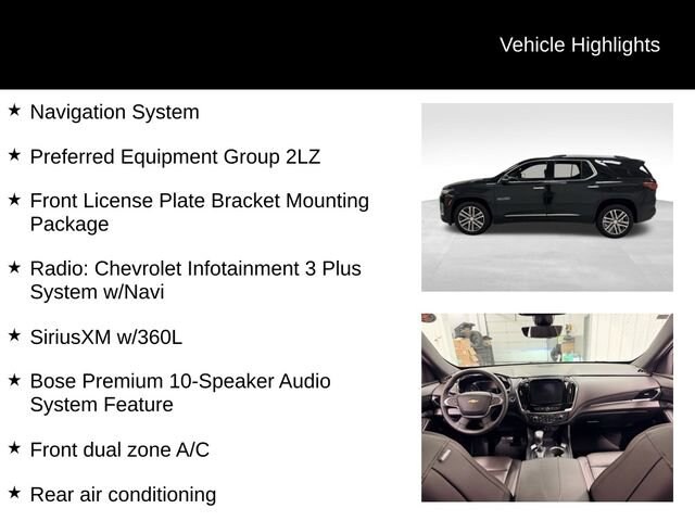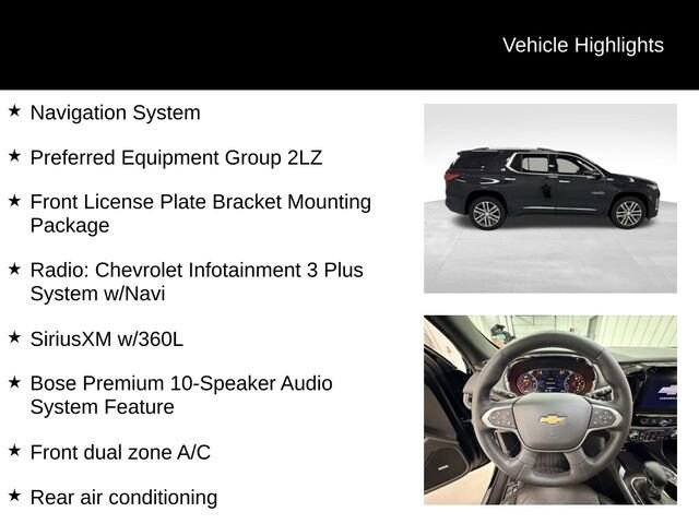 Step inside and you'll be greeted by a wealth of premium features, including the Bose Premium 10-Speaker Audio System, Chevrolet Infotainment 3 Plus System with Navigation, and SiriusXM with 360L. Enjoy the comfort of heated and ventilated front seats, a heated steering wheel, and dual-zone climate control. The Traverse also offers ample space for your family and cargo, with a split-bench third-row seat and a power liftgate for easy access.