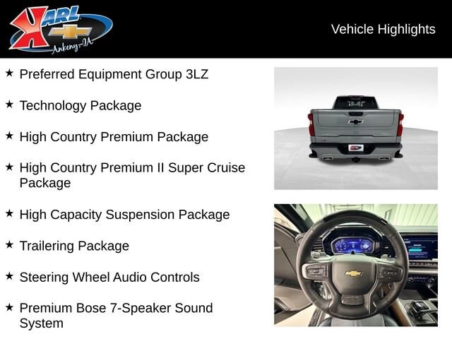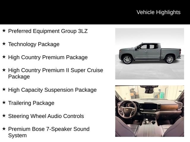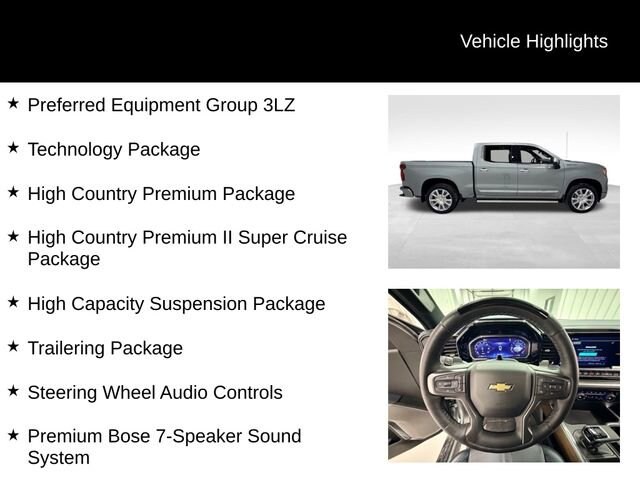 This 2026 Chevrolet Silverado 1500 High Country 4WD CREW 147 is packed with premium features that elevate your driving experience. From the powerful 3.0L I-6 Diesel Turbocharged (Duramax) engine to the advanced Adaptive Ride Control suspension, this truck is engineered to deliver exceptional performance and capability. The High Country Premium II Super Cruise Package adds a suite of cutting-edge technology, including the revolutionary Super Cruise hands-free driving system, to keep you connected and in control.