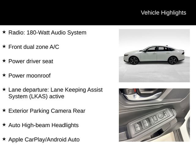 The interior of this Accord Hybrid is packed with premium features, including a 180-watt audio system, front dual-zone climate control, and a power driver's seat. The Lane Keeping Assist System (LKAS) and Auto High-beam Headlights ensure a safer and more convenient driving experience, while the Apple CarPlay and Android Auto integration keep you connected on the go.