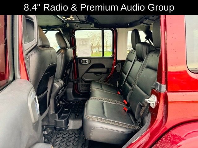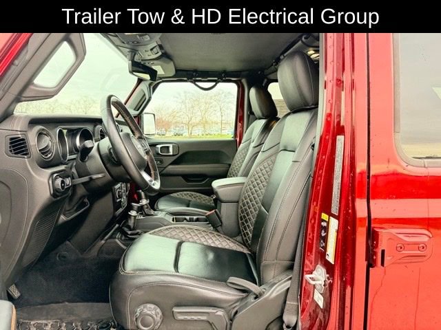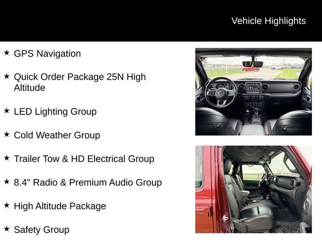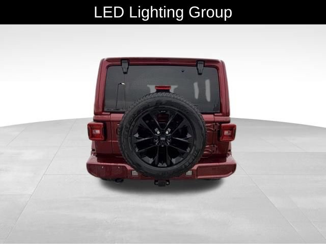 The exterior of this Wrangler Unlimited Sahara High Altitude is a striking Snazzberry Pearlcoat red, complemented by a body-color hard top, fender flares, and premium dark exterior accents. The LED lighting, including headlamps, fog lamps, and taillamps, provide excellent visibility and a modern, sophisticated look. The 20-inch fully painted aluminum wheels add a touch of style and further enhance the Wrangler's bold, off-road-ready appearance.